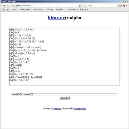 <input type="text" name="q" id='q' size=100 onChange="calc()">というようにしてみます。こうすると、テキスト入力部でEnterキーを押したときにも演算処理がされることになります。つまり、普通にMathematicaのフロントエンドを使うような感覚で数式処理をすることができるようになるわけです。