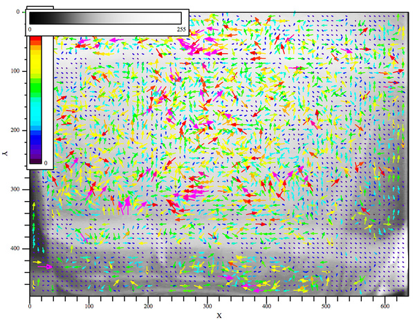 そこで、PIVにより描き出したギネスカスケード中の速度場のようすが、下に貼り付けた図です。(動画では視認される)グラス外周の泡沈降のようす抽出できていませんが、グラス中央で生じている泡が上昇しているさまは見えています。ギネスビールが可視光では黒茶色で不透明なために、不思議に見えるギネスカスケードですが、近赤外線で撮影した上で泡の動きの速度場を眺めてみると、自然で当然の現象であることがわかります。