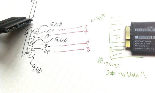 そんな時のために、この(Macbook Air SSD<−>SATA)変換基板配線を参考に、「こんな感じにハンダ付けすればOKかな?」というラクガキをしてみました(検証無し&ビール飲みつつ描いたもの)。