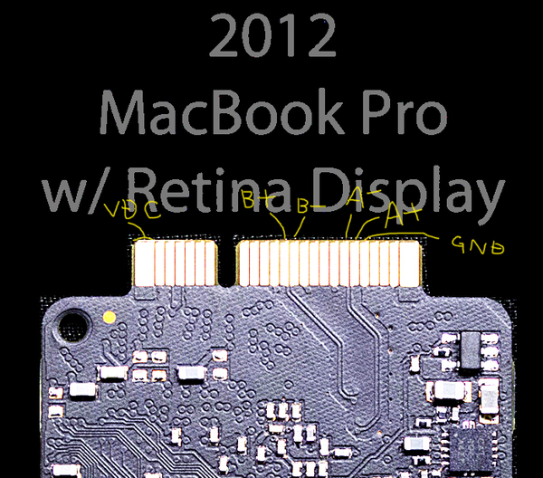 というわけで、今日はOWC BLOGに掲載されていた新モデルのSSD写真を参考に、Macbook Air 2012とMacbook Pro RetinaモデルのSSDを外部SATA接続するためのコネクタ配線接続の「予想図(間違ってる可能性も大きい)」を描いてみました。