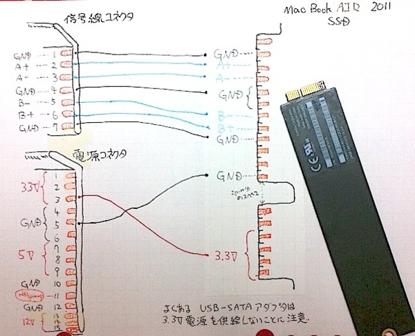 Macbook Air のSSDは3.3Vの給電を必要とするので、SATAの電源ケーブルが3.3Vを出力している場合には、Vdcに3.3Vを突っ込んで、データ配線+GND/Vdcのトータル6本をハンダ付けするなどすれば…Macbook Air(2011以降)内蔵SSDを他コンピュータでSATA接続して使うことができるかもしれません!?
