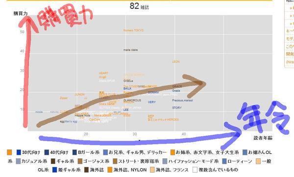 このグラフを見ると、non-no・JJ・LEONが一直線に並んでいたりして、少し面白いです。年齢が高くなっても若い頃のままの購買力の増加を保ち続けているのが、LEONなんだろうかとか想像したくなります。また、同じ赤文字・女子大生系でも、JJよりCanCamの購買力が低い!?なんていう姿が見えたりします。さらに、CanCamとAneCanもほぼ一直線上に並んでいて、その先にはSTORYがいます。つまり、「CanCam → AneCanという道を真っ直ぐにそのまま進んでいくと40歳を過ぎる頃にはSTORYを読んでいるかもしれない!?」というような想像ができたりするわけです。