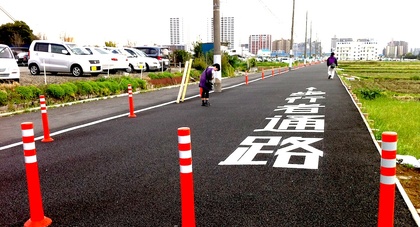 下の写真は、今週眺めた「ナニコレ珍百景」です。東京・横浜の近くの田舎町、JR相模線の海老名駅の北には、畑の中を「大歩道」が通っています。限りなく狭く細い車道の横に、これ以上ない広さの歩道が作られているのです。「歩行者通路」と白い塗料で太く・大きく記された歩道の横には、人が歩くのにも狭く感じる車道があります。私たちがよく眺める車道と歩道の主従関係が逆転し、しかもそれが畑のどまん中にある…という実に不思議な景色です。