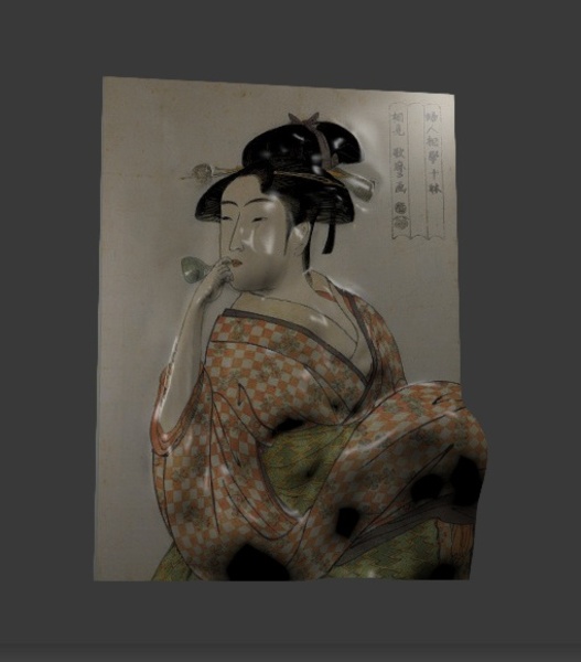 blender で浮世絵を手作業でデコボコにしてハイライト付けてホーロー看板みたいにしてみました。あまり萌えませんがw 髪の毛の感じなどはもうちょっとなんとかなりそうな。。。でも完全な自動化は大変そうな気がします